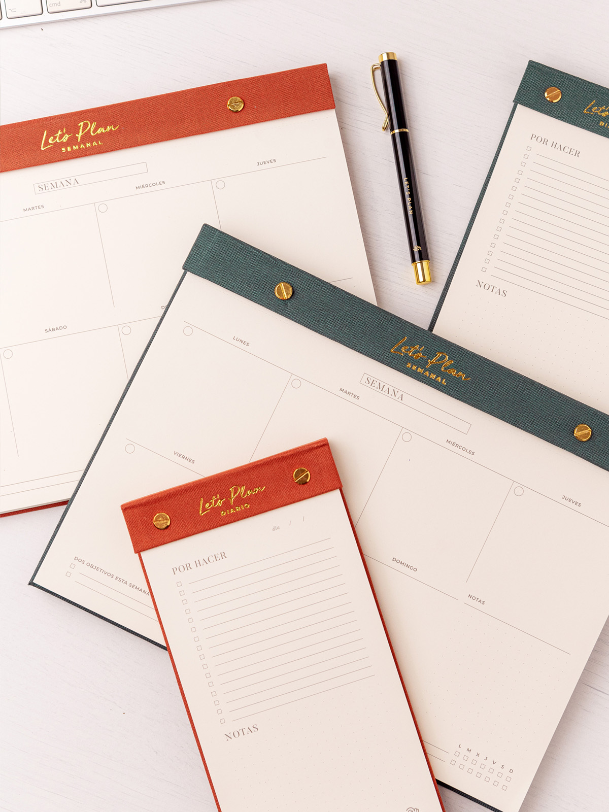 Incluye: Planificador semanal “Proyecto Semanal” teja + Planificador Life/Work + Notepad teja diario + Notepad teja semanal.