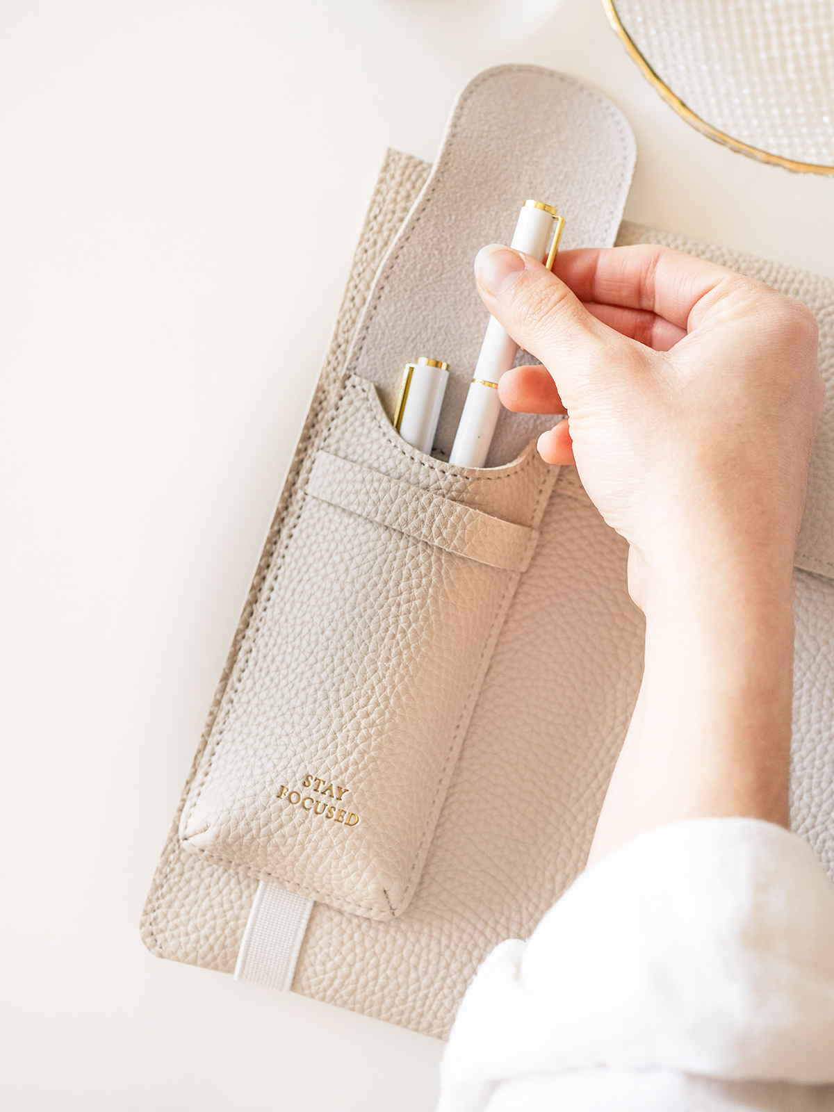 Es precioso, diseñado en cuero vegano en color Greige, Black Amber o White Lotus.Estuche diseñado en cuero vegano.